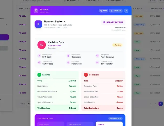 Payslips are essential documents, serving as a digital proof of employment. The HR department can use Renown CRM to automate, generate, and share detailed payslips with their employees and build trust on ther company.