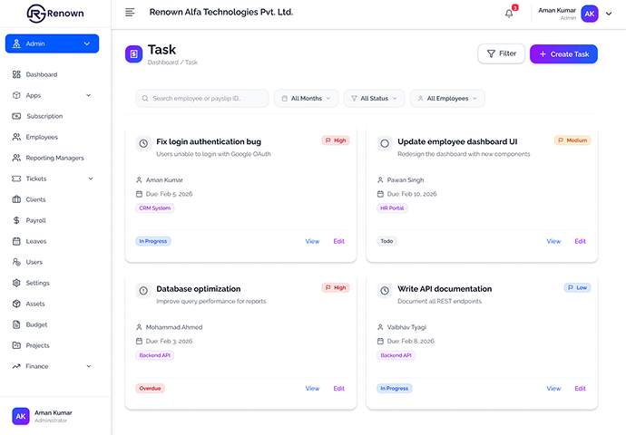 A Task Management System helps you organize, assign, and track tasks efficiently across your team. It ensures clear communication, better accountability, and timely completion of work—all from a single platform. With a structured task management system, teams can break down complex projects into manageable tasks, assign responsibilities, and track progress with ease.